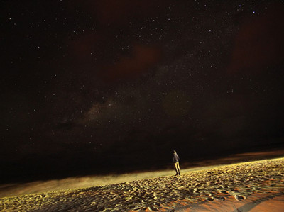 Lake Malawi, Africa. A stargazer looks into the endless cosmos as waves lap along a beach in Southern Malawi.