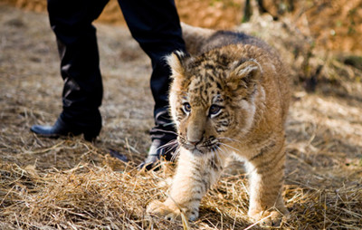 Five-month-old baby liger Xinle (happy heart) walks around his enclosure at Ningbo Youngor Zoo in East China's Zhejiang province, Jan 17, 2012.