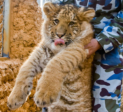 Five-month-old baby liger Xinle (happy heart) plays with a zoo worker at Ningbo Youngor Zoo in East China's Zhejiang province, Jan 17, 2012.
