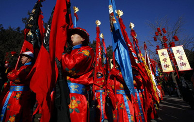 Performers wearing traditional costumes march as they take part in an ancient Qing Dynasty ceremony in which emperors prayed for good harvest and fortune, during the opening of the temple fair at Ditan Park, also known as the Temple of Earth, in Beijing January 22, 2012.