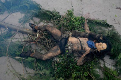 Wearing weird mask and fur, a man lies on the ground to welcome in spring in a carnival in Spain.