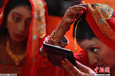 一名新娘(图右)在婚礼前照镜子检查她的新娘饰品。