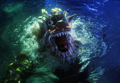 A dragon's head appears out of water as divers perform a dragon dance at Underwater World