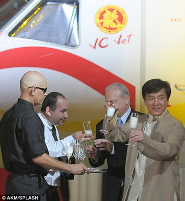Sweet deal: Jackie Chan toasted his new jet during a news conference Feb.5th in Sao Paulo, Brazil.