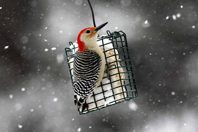 A Red-bellied Woodpecker perches on a suet feeder during a winter storm in the village of