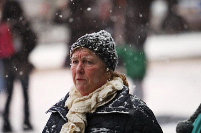 时代广场,一名观光客身上覆满积雪。