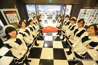 Young waitresses dressed as maidservants welcome customers at a costume play or cosplay dining room in Yangzhou, East China's Jiangsu province on Feb 5, 2012.