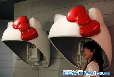 可爱的Hello Kitty电话亭。白色的脑袋,红色的蝴蝶结,女孩儿站在里面打电话,真是太可爱了。