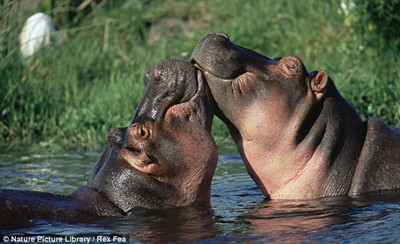 Give us a kiss: Two hippos move in for a smooch as they court in a mating ritual.