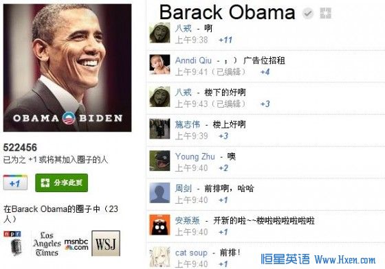 The latest entries on Obama’s Google Plus page over the weekend were related to the upcoming presidential election. They have attracted around 1,000 comments, mostly in simplified Chinese with some English translations. 奥巴马于1月31日让自己的Google+帐号通过了实名认证,主要是为了推广即将到来的总统大选。奥巴马的Google+页面迅速吸引了中国网友1000多条评论,多为简体汉语,也有一些英语留言。