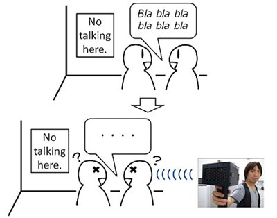 Kazutaka Kurihara and Koji Tsukada have built a gun they call the "Speech Jammer", which could be ideal for an unruly classroom or noisy library. 据英国《每日邮报》报道,栗原一贵与冢田浩二制作的“弹话枪”能从30米开外准确无误地击中目标,正是乱哄哄的课堂和嘈杂的图书馆里的不二选择。
