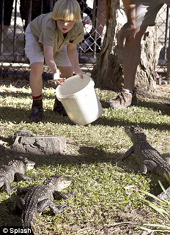 The apple doesn't fall far from the tree, and that certainly is the case for the son of the late Crocodile Hunter Steve Irwin. The youngster is following in the dangerous footsteps of his dad and was seen feeding alligators at Australia Zoo. The eight-year-old was spotted getting close to the American alligators for a crowd of about 200 people at the Irwin family-owned zoo in Queensland.