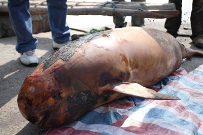 尸体解剖发现,这些死亡的江豚大多有一个共同特点:消化系统里没有任何食物残留。尽管死因尚未明确,但专家分析,导致江豚死亡的原因可能有三个:感染传染性疾病、中毒、饿死。图为4月14日,新华联富润公司员工将湖南省岳阳市洞庭大桥以南水域死亡的江豚抬上岸。