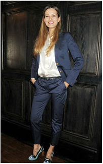 Blue on blue on blue? Wearing a navy blazer and pants with lighter blue heels, like Petra Nemcova, is a fun way to mix up a traditional style.