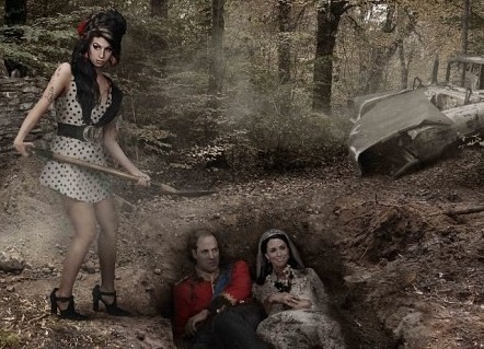 In one rather shoddily-Photoshopped image, dead singer Amy Winehouse is seen holding a spade, having dug a grave in which William and Kate, dressed in their wedding outfits, are seen lying.