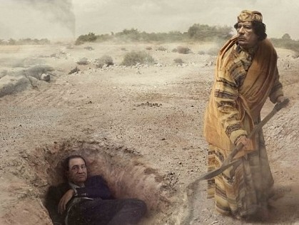 In another shocking image, shot Libyan dictator Colonel Gaddafi is seen burying deposed Egyptian president Hosni Mubarak in the desert.