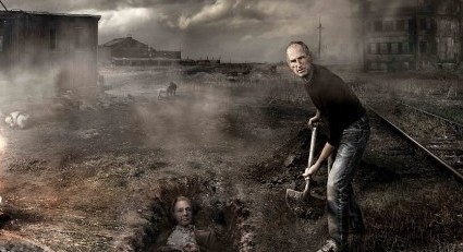 (图为死于2011年的苹果创始人乔布斯掩埋维基解密的建立者利安·阿桑奇。图片场景好似核战的战场残骸。)