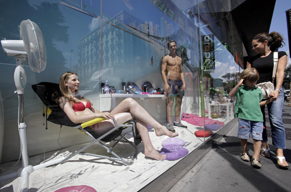 | Models pose as mannequins as part of a protest in a COIN department store window in downtown Milan July 18, 2011. |