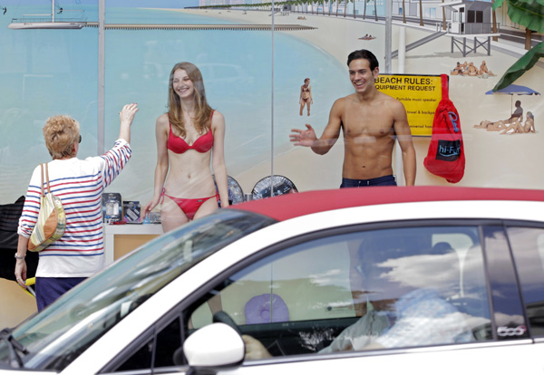 | A woman waves to models posing as mannequins as part of a protest in a COIN department store window in downtown Milan July 18, 2011. |