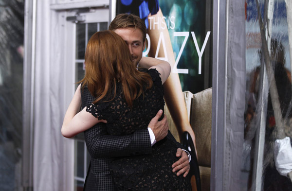 | Cast members Ryan Gosling and Emma Stone hug as they arrive for the premiere of their film 'Crazy, Stupid, Love' in New York July 19, 2011. |