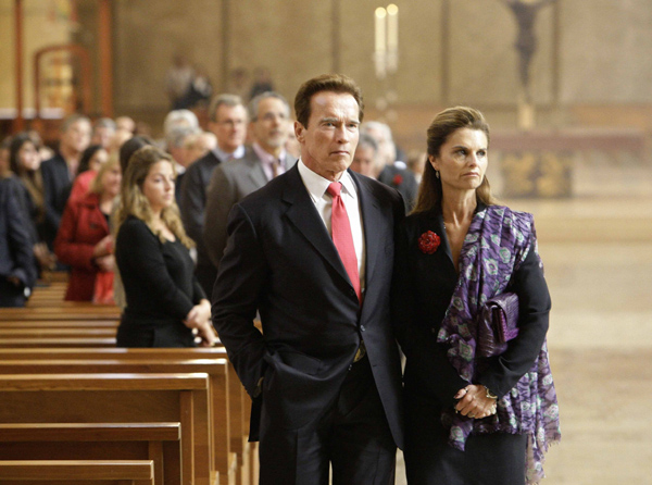 | California Governor Arnold Schwarzenegger and his wife Maria Shriver (R) attend funeral services for Italian film producer Dino De Laurentiis in Los Angeles November 15, 2010. |