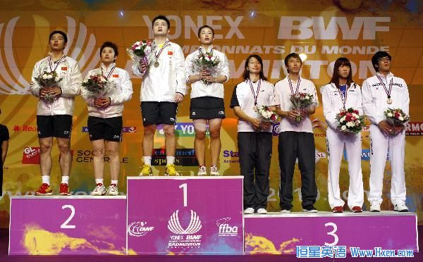 | China's Zheng Bo (3rd L)/Ma Jin (4th L) and He Hanbin (L)/Yu Yang (2nd L) stand on the podium after the mixed doubles final at the 2010 World Badminton Championships in Paris, France, on Aug. 29, 2010. Zheng Bo/Ma Jin claim the title after winning the match against He Hanbin/Yu Yang with 2-0. |