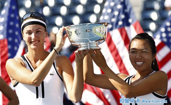 | Vania King (R) of the U.S. and Yaroslava Shvedova of Kazakhstan pose with their trophy after defeating Liezel Huber of the U.S. and Nadia Petrova of Russia during the women's doubles final at the U.S. Open tennis tournament in New York, September 13, 2010. |