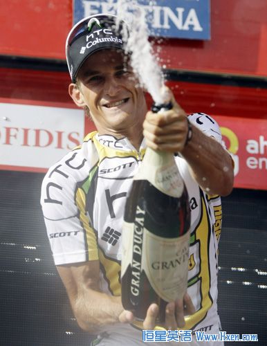 | Team HTC-Columbia rider Peter Velits of Slovenia celebrates with a bottle of cava after winning the individual time trial 17th stage of the Tour of Spain "La Vuelta" cycling race in Penafiel, September 15, 2010. |