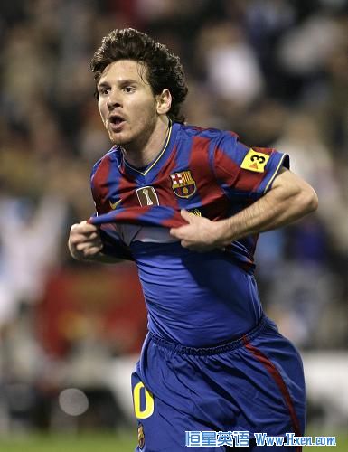 Barcelona's Lionel Messi celebrates his second goal against Zaragoza during their Spanish first division soccer match at La Romadera stadium in Zaragoza. March 21, 2010. |