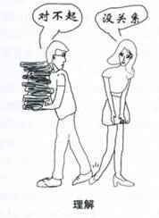 上图中,一个手里捧着很多东西的先生无意中踩了旁边女士的脚。在他有礼貌地道歉后,这位女士不仅接受了他的道歉,还让他不必在意。