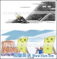 如图第一幅图所示,在求学的大山上一个学生疲惫的攀爬着,好不容易快到了山的顶峰,却不得不吃惊且尴尬的发现还有一座高很多的山他必须去爬,那就是找到一份工作。但是在另一幅图中我们看到,在招聘公务员的广告牌前面站着一堆人,而在招聘服务员的牌子前却只有一个人。最近报纸上对这样图画的讨论有很多。这些图虽然简单,但是却确实表明了一个发人深思的社会现象。