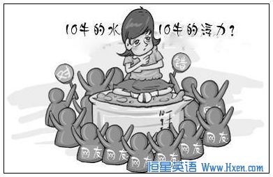 本图中,一个女孩正在因一个问题感到困惑,“10牛的水是否产生10牛的浮力?”。于是她上网求助于网友,网友的答案更是五花八门,说对说错的都有。女孩更加困惑。由此可见,这幅图反应了这样一个现实:网络文化有利也有弊。因此本文可以这样设计: