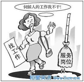 As is vividly depicted by the drawing above, the job-hunting girl refuses a service post without any hesitation, complaining that she will never take a job of serving others①. At the same time she is wondering why finding a promising job is so difficult in modern society②。