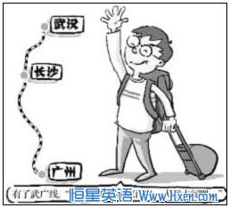 As is vividly depicted by the picture above, a traveler happily starts his journey by high-speed railway from Guangzhou to Wuhan. In the year of 2009, Wuhan-Guangzhou high-speed railway went into operation, reducing travelling time from 12 hours to 3 hours, bringing much convenience to the transportation between the two cities①. No wonder the caption in the picture says “with the Wu-Guang high-speed railway, cities far away is just like a place nearby”。
