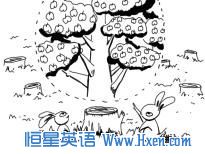 这幅图描绘了一个悲剧的场景:森林中,一只兔子正向幼兔讲述过去的事情,在它们周围到处都是刚被砍掉的大树留下的树桩,而且这些树桩仿佛也在悲叹失去的生活天堂。