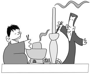 In the cartoon we can see a tall and thin man, along with a short and stout man are using suitable hotpot for dinner. Apparently, the picture aims to emphasize that anything to be done must be measured in advance so that we are able to find a proper way to do it.