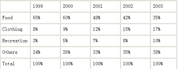In the past five years, there have been great changes in people's daily expenses in a city. The amount of money spent on food decreased gradually. However, there was a rapid increase in clothing expenses. In addition, the recreation expenses went up. It is the same with other expenses.