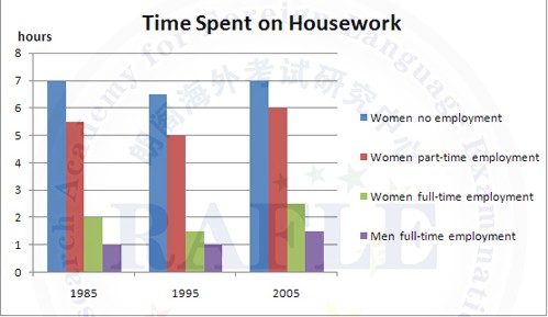 1. 注意时态,1985, 1995, 2005年数据要用过去时。 2. 动态数据的描写应注意句式的变化。 3. 重点数据为无业和兼职女性做家务的时间,应详细描写。 4. 在引言段中应先概述整个图表的趋势。 |
