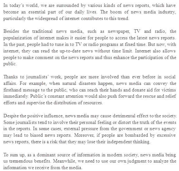 这个题的素材改装了网络媒体的优势、新闻记者的品质,再结合了一个公众通过媒体参加公益活动的例子。看看近期的几篇范文,今后你应该能够搞定媒体类话题。