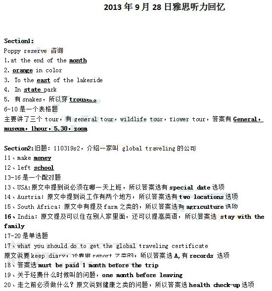 2013年9月28日雅思听力真题回忆(新东方版)