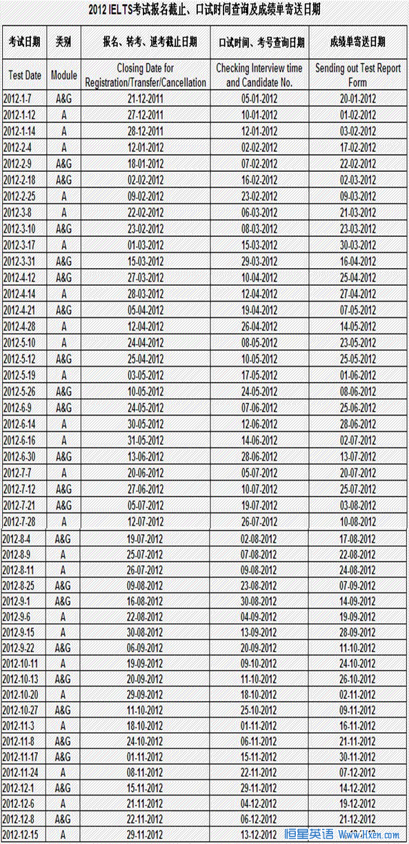 2012全年雅思考试报名截止、口试时间查询及成绩寄送日期