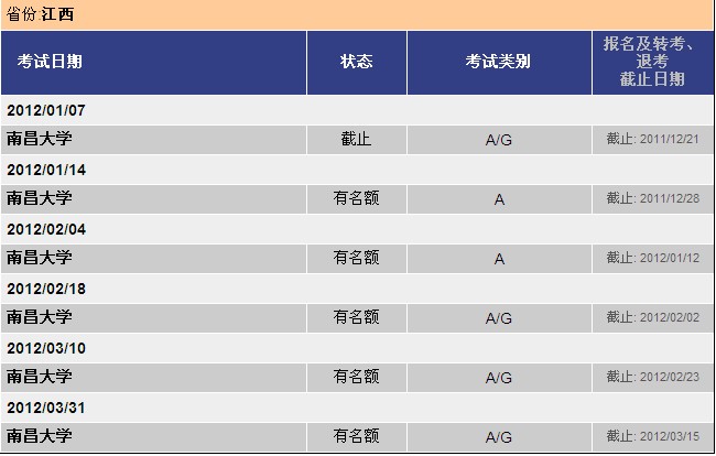 2012年1-3月份江西雅思考试状态、类别及截止日期一览表