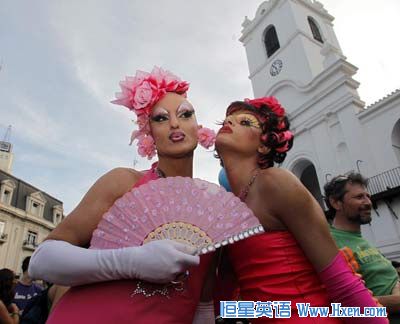 上周六,成千上万的人参加了阿根廷的同性恋光荣大游行,庆祝阿根廷成为拉美首个将同性婚姻合法化的国家,并宣誓为变性人争取新权益。