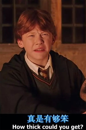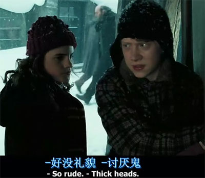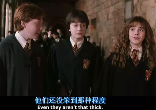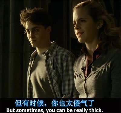 现在我们再回过头看一下《哈利•波特》中的几处thick,你就会发现,不是所有情况都可以替换成stupid,特别是最后一个画面,当Hermione对Henry说:“But sometimes, you can be really thick.”的时候,thick代表的是一种傻傻的执着与盲目,在这种略带埋怨的责备后边是一种“你可以依靠朋友的帮助,比如说我和Ron,而不用一个人去涉陷”的潜台词,在这个时候换成stupid的话,这层意思恐怕就表达不出来了。