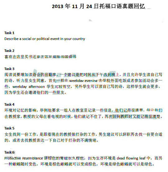 2013年11月24日托福口语机经整理(新东方版)