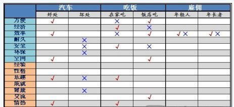首先,汽车使人们的出行更加方便,这是一个不争的理由,所以在“好处”一栏里打勾;同时,汽车为人们的生活带来的效率,加速了生活节奏,这一点也很明显,打勾。当然,拥有汽车的家庭可以经常出门自驾游,男女老少共聚一车,齐享天伦之乐,增进了家人间的情感。而汽车的出现还使得人们的出行活动具有了一定的私密性,不至于情侣间的蜜月旅行还要挤在一个人声鼎沸的火车车厢内,所以,“空间”方面汽车也有明显的好处。由此可见,汽车具有“方便”、“高效”、“增进人际情感”和“空间私密”多项优点。