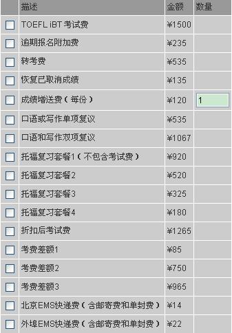 图注:与托福考试有关的收费一览表